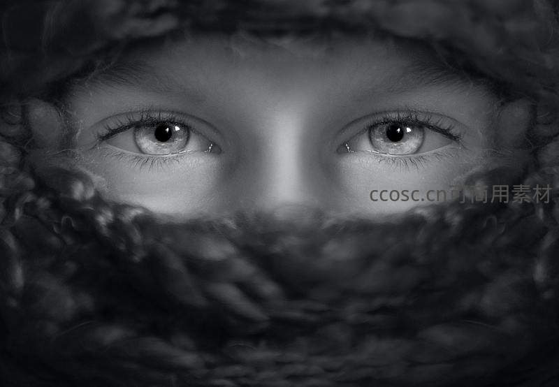 单色影像中,女孩被厚重毛绒围巾半遮面庞,仅露出清澈双眸直视镜头,传递静谧、孤独又充满故事感的情绪氛围。