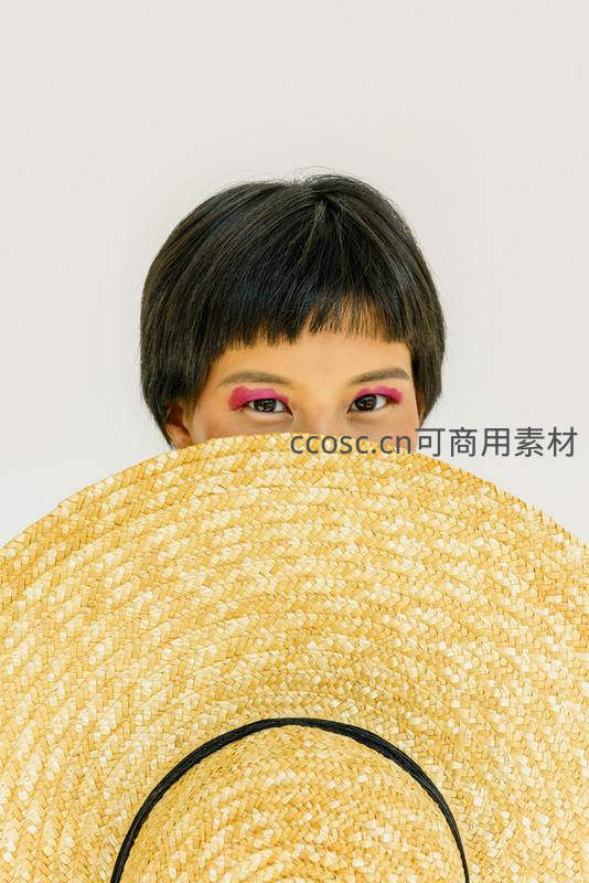 短发女孩用宽檐草帽遮住半张脸,只露出画着亮粉色眼影的双眼,充满童趣与时尚感。