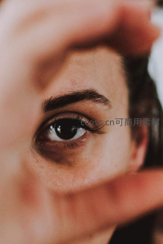 一只手在前景虚化,框住了一只专注凝视的眼睛,通过这种构图方式制造了“窥视”的趣味性,同时突出了眼神的力量与神秘感,引人遐想。