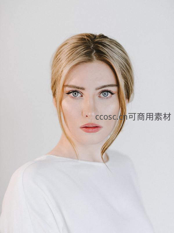 金发女子身着纯白上衣,在纯净背景中直视镜头,蓝眸清澈,妆容自然,整体构图简洁,传递出宁静、自信与现代美学的融合。