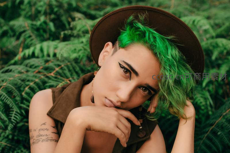 绿发女子戴棕色宽檐帽,倚靠在茂密蕨类植物间,手臂纹身隐约可见,手托下巴姿态慵懒,营造出自然、艺术与个性交融的独特氛围。