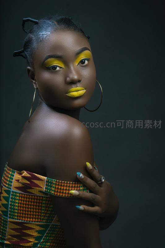 模特身着传统非洲印花服饰,搭配鲜艳黄色眼妆与唇妆,造型大胆前卫,展现出浓郁的民族文化与现代时尚融合之美。