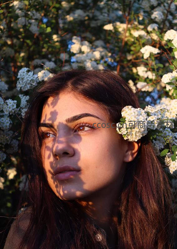 一位年轻女子置身于盛开的白色花丛前,柔和的阳光透过枝叶在她脸上投下斑驳的影子,营造出宁静而富有诗意的春日氛围。