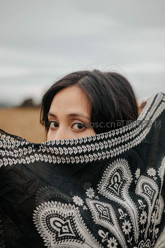 一位女性用带有精美佩斯利花纹的黑色面纱遮住半张脸,只露出一双深邃的眼睛直视镜头,背景模糊,突显其神秘感与故事性。