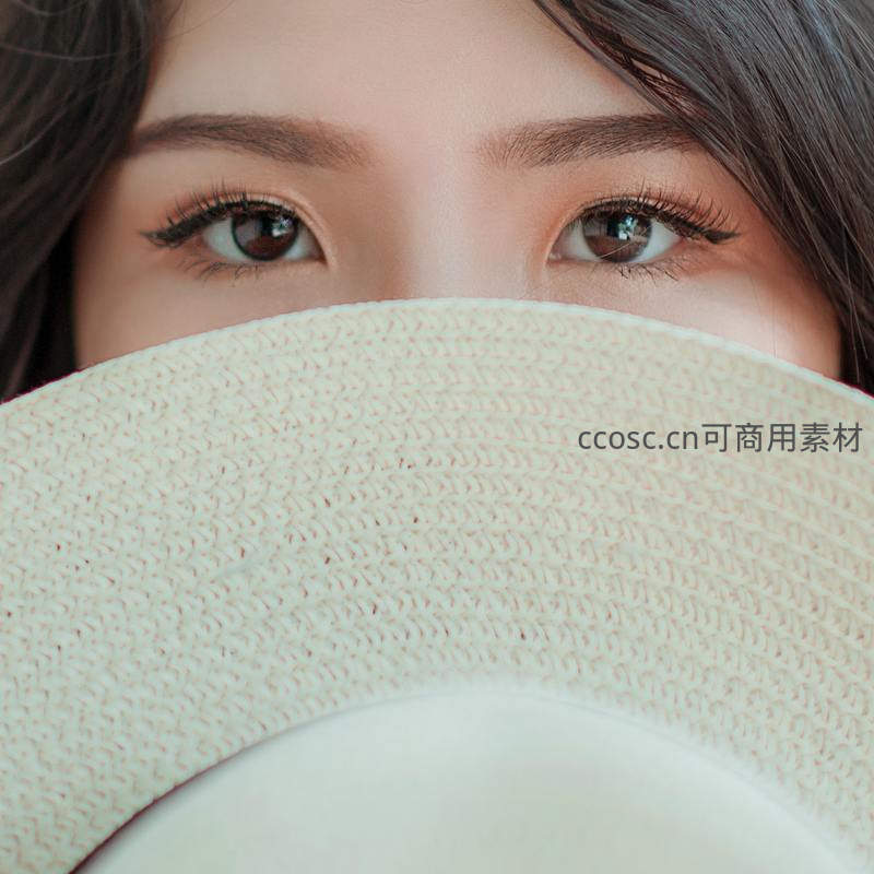 一位女性用米色草帽优雅地遮住半张脸,仅露出明亮有神的双眼,眼神温柔而富有故事感,展现精致妆容与自然光下的细腻肤质。