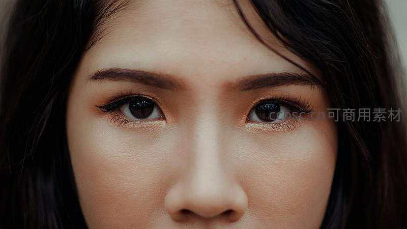 近距离捕捉女性清澈深邃的双眸,妆容自然无瑕,皮肤质感细腻,黑发柔顺垂落,传递出宁静、专注与内在力量,凸显五官的精致与和谐。