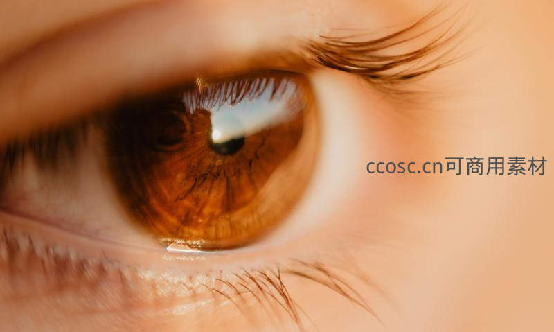 超近距离拍摄的人眼特写,棕色虹膜清晰可见,瞳孔中倒映着蓝天白云,细腻睫毛与泪光增添生命力,展现人体微观之美。
