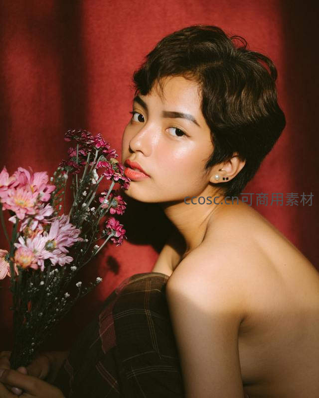 一位留着俏丽短发的年轻女子,手持一束粉紫色小花,轻嗅花香,眼神温柔,背景是浓郁的红色幕布,营造出静谧而浪漫的氛围。