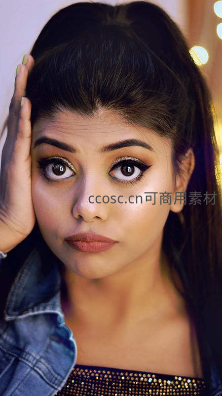 女孩手托脸颊凝望镜头,闪亮眼妆引人注目