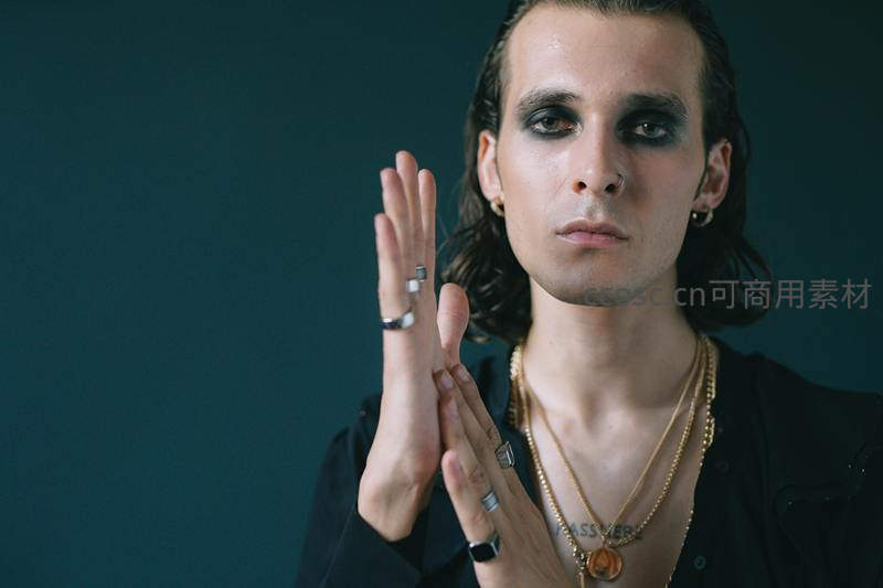一位化着浓重哥特式眼妆的青年,佩戴多枚戒指与项链,双手在胸前做出优雅而神秘的手势,深色背景更显其独特气质。