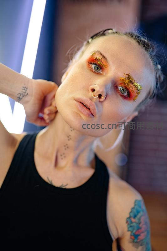 女孩眼周点缀金色亮片,颈部与手臂可见精致纹身,身穿黑色背心,手抚颈侧,眼神冷峻,散发朋克与艺术融合的独特气质。
