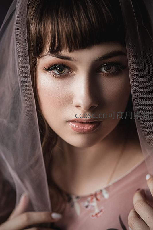 女子身披轻盈薄纱,妆容淡雅,眼神温柔地凝视前方,营造出宁静、浪漫且略带神秘感的氛围。