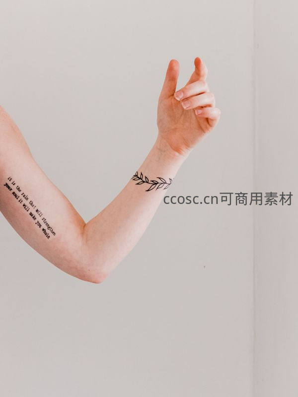 洁白背景前,一只纤细手臂展示着精致的黑色纹身:腕部是简约叶脉图案,上臂是英文励志短句,展现现代女性的文艺与独立气质。