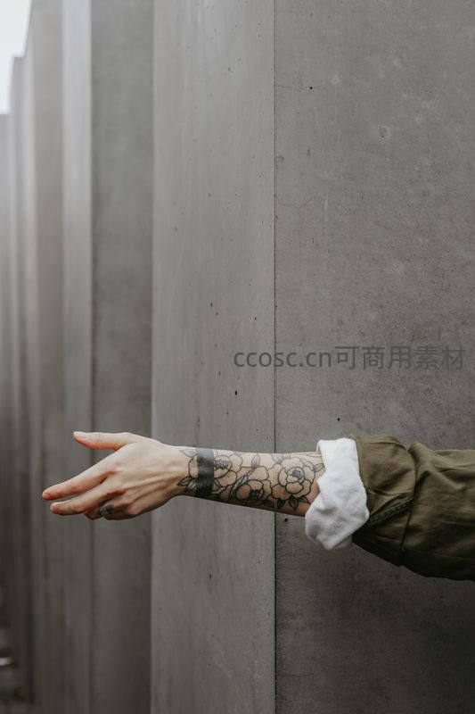 纹身手臂轻触灰色混凝土墙