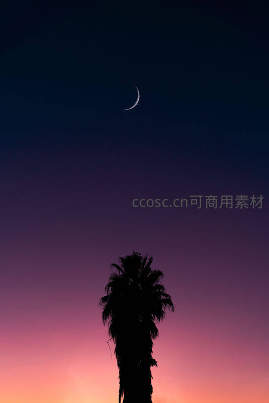 一弯新月悬于渐变的紫粉色晚霞天空,下方是高大棕榈树的黑色剪影,构成一幅宁静而富有异域风情的黄昏景象。