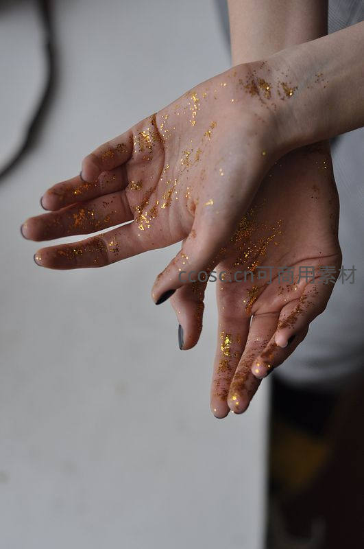 一双涂着黑色指甲油的手上洒满了细密的金色闪粉,在光线下熠熠生辉,展现了精致的美感与艺术气息。