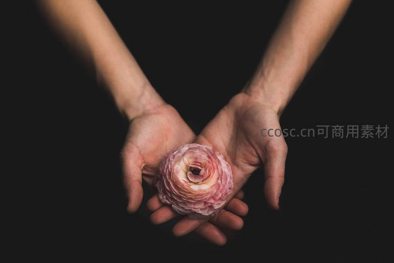 一双纤细的手掌心向上,轻轻托着一朵盛开的粉色毛茛花,花瓣层层叠叠,在纯黑背景下显得格外柔美纯净,传递出爱与呵护的情感。