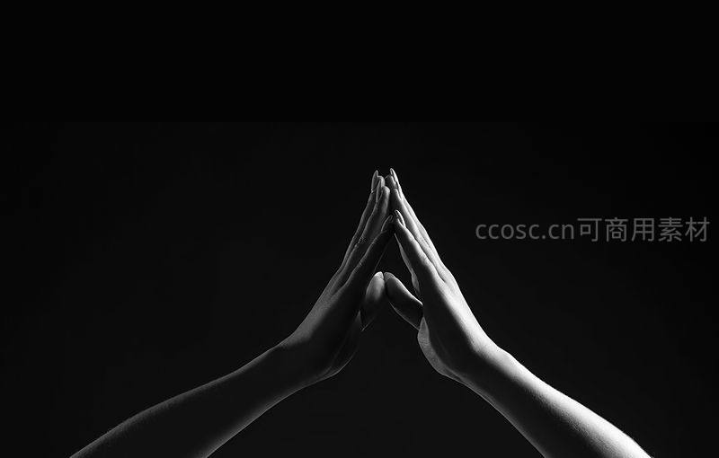 黑白光影中双手合十祈祷