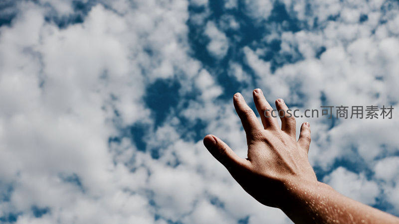 一只手掌向上伸展,仿佛要触摸头顶上那片蔚蓝天空中飘浮的洁白云朵,传递出对自由与无限可能的向往。