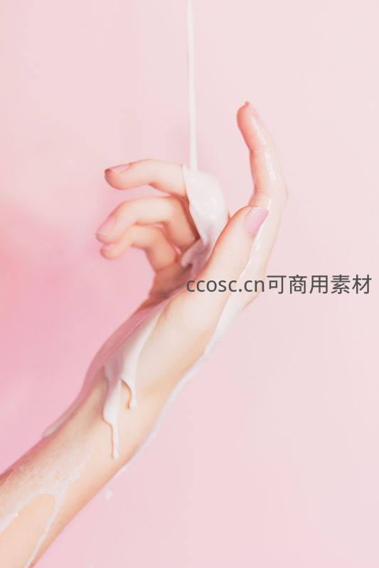 一只涂着淡粉色指甲的手轻托缓缓流下的白色奶油,背景为纯净粉色调,视觉上温柔甜美,充满治愈感和食欲诱惑。