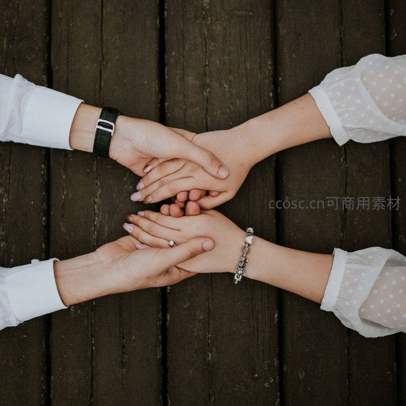 俯拍视角下,三只不同大小的手温柔叠放,一只戴着手表,一只戴着串珠手链,背景是深色木板,传递出家人之间紧密相连的温情。