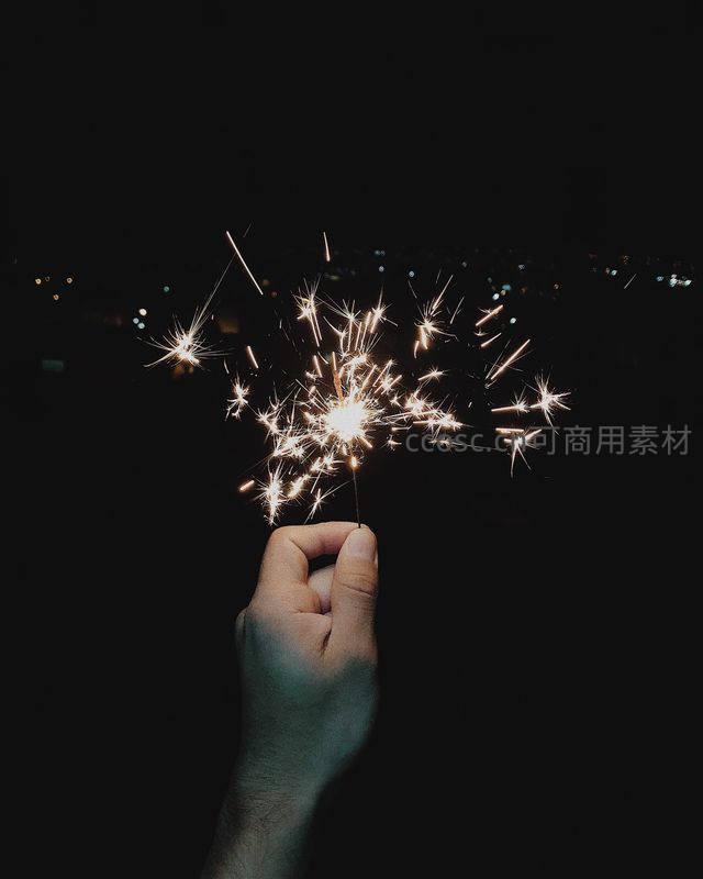 一只手在漆黑的夜幕下握着燃烧的烟花棒,火花四溅,远处城市灯火朦胧,营造出温馨而梦幻的节庆氛围。