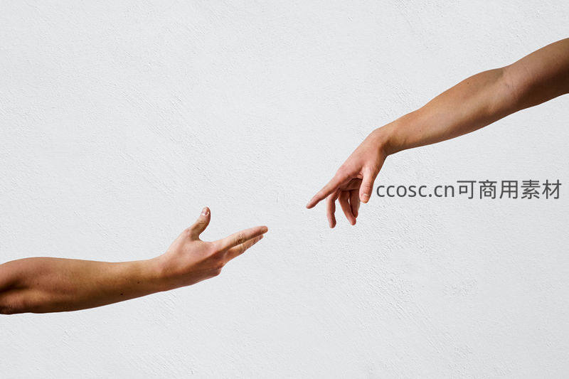 在纯净的白色背景下,两只手臂从画面两侧伸出,手指几乎要触碰到一起,象征着沟通、联系或即将发生的深刻互动。