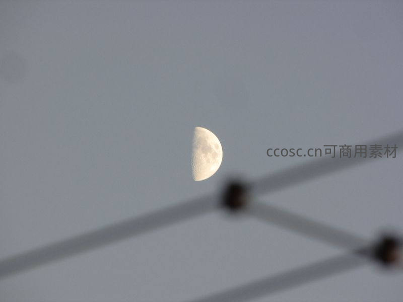 半轮明月高悬于灰蓝色天空,前景模糊的电线杆形成几何线条,现代城市元素与自然景象巧妙融合。