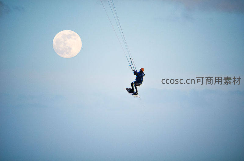 一名风筝冲浪者在空中腾跃,背景是巨大的满月,动感十足的画面展现了人与自然力量的和谐共舞。