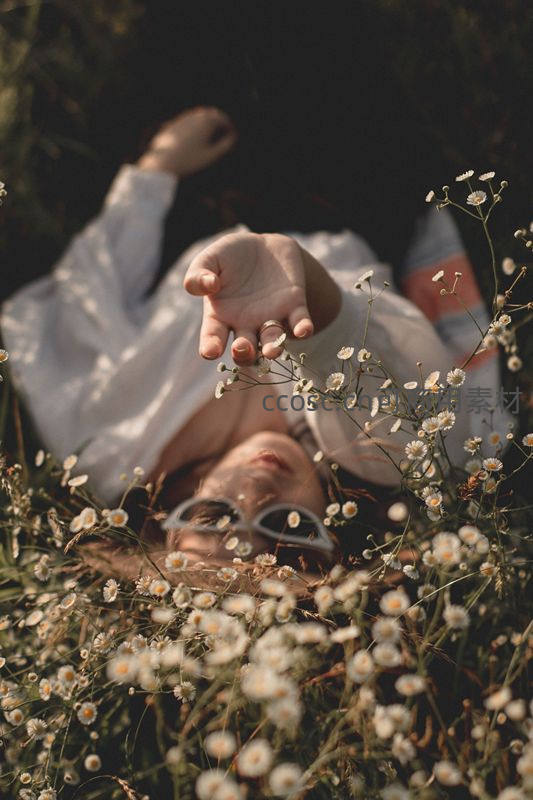 一位少女身着白裙躺在开满雏菊的草地上,伸手向天空,阳光透过花瓣洒落,画面宁静唯美,充满田园诗意与自由气息。