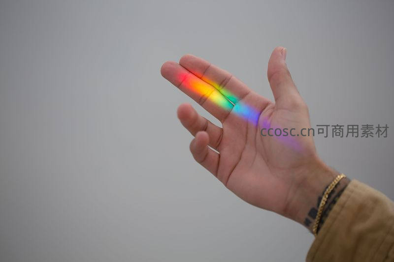 一束彩虹光斑投射在张开的手掌上,形成绚丽的视觉效果。背景简洁,突出光线与皮肤的互动,展现科学现象与人体结合的美感,富有创意与想象力。
