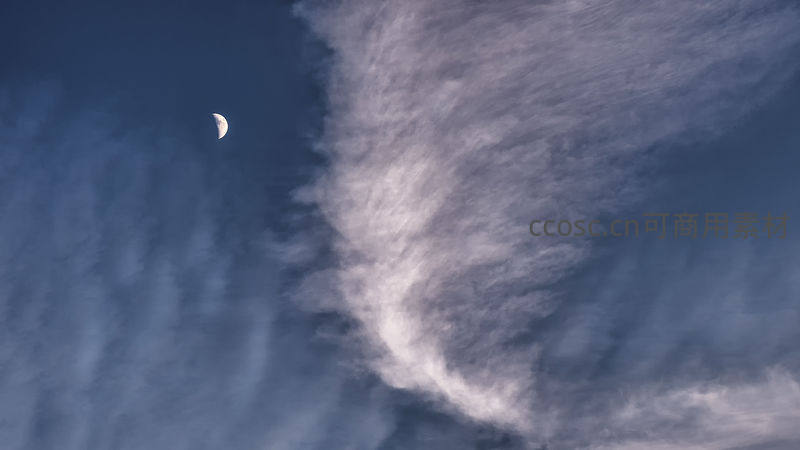 一片轻盈流动的云海占据了画面大部分,一弯小小的月牙孤悬于左上角,整个场景显得清新而宁静。