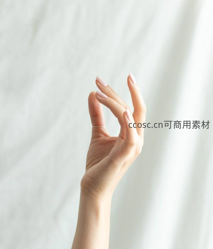 一只修长的手在纯白背景下轻抬指尖,指甲修剪整齐并涂有淡雅色彩,整体画面简洁纯净,突出女性柔美与精致的生活态度。
