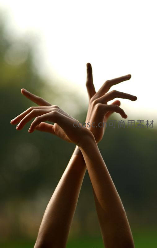 在模糊的绿色背景前,一双修长的手臂交叉向上伸展,沐浴在柔和的逆光中,展现出自由、舒展与生命力,充满艺术感与自然之美。