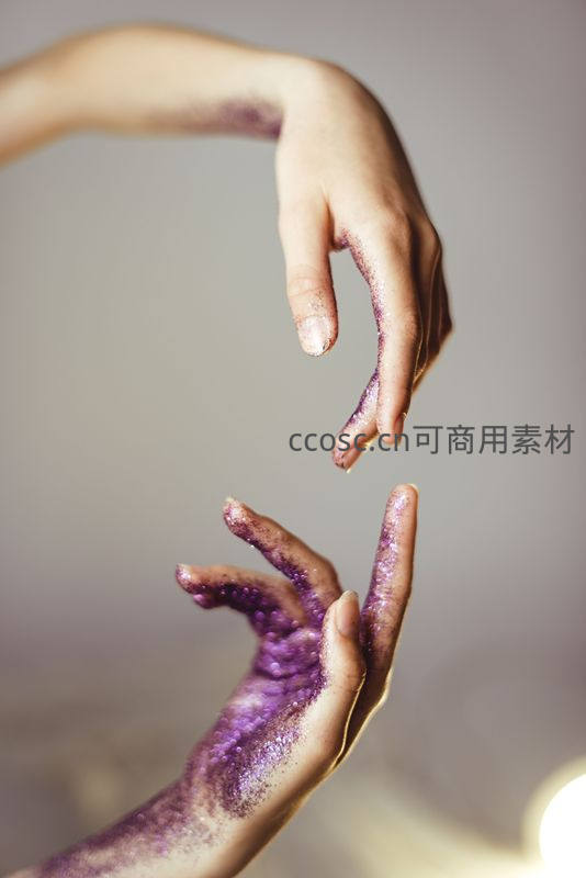 两双手覆盖着细腻紫色闪粉,在柔和光线下即将相触,营造出神秘而浪漫的氛围,适合创意广告或艺术项目。