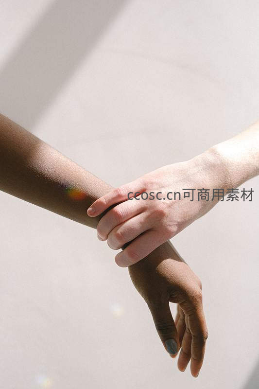 两只不同肤色的手在柔和光线下轻轻相握,手臂上洒落彩虹般的光斑,传递着跨越差异的温暖与连接。