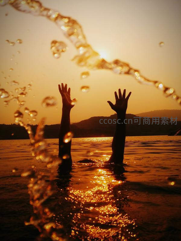 夕阳余晖中,一双人手从金色水面奋力举起,前景飞溅的水珠晶莹剔透,营造出挣扎、希望与自然壮丽交织的意境。