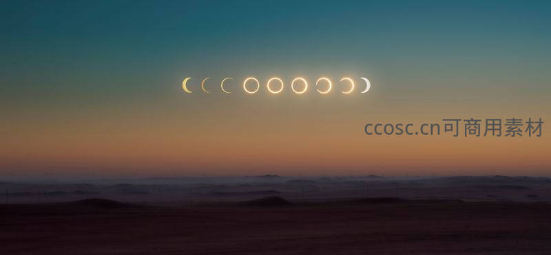 在广袤无垠的沙漠上空,从左至右排列着完整的月相变化过程,背景是绚丽的日落余晖,生动地展现了月亮盈亏的自然规律与时间流逝。