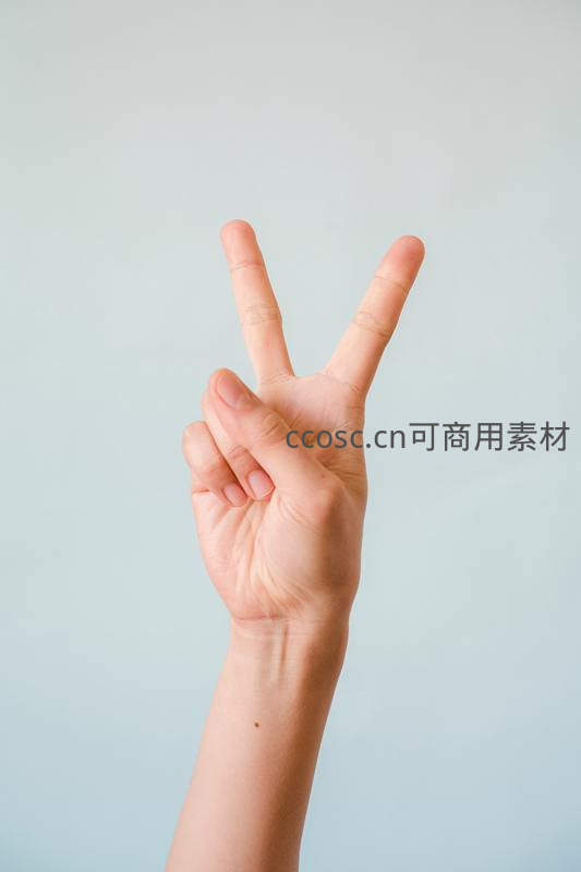 一只手掌心朝向镜头,食指与中指竖起形成经典的“V”字胜利手势,背景为柔和的浅蓝色,寓意成功、和平与积极乐观的情绪。