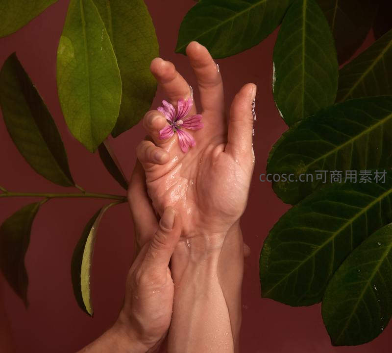 湿润的双手轻柔地捧着一朵娇嫩的粉色小花,周围环绕着翠绿的叶片,水珠晶莹剔透,营造出宁静而充满生机的氛围。
