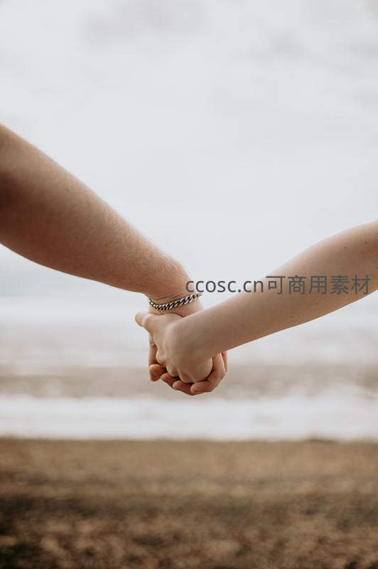 沙滩上紧握的双手传递温暖羁绊