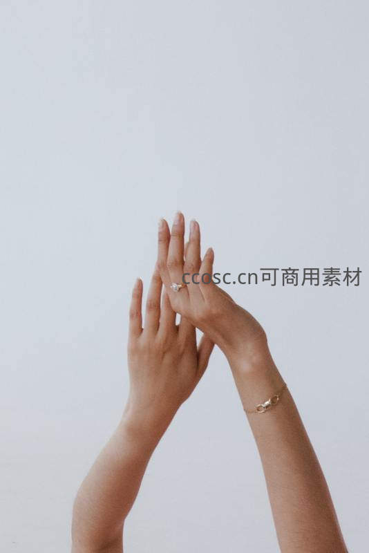 一双纤细的手在纯白背景下交叠,无名指上的钻石戒指闪耀夺目,手腕佩戴金色手链,尽显精致与浪漫。