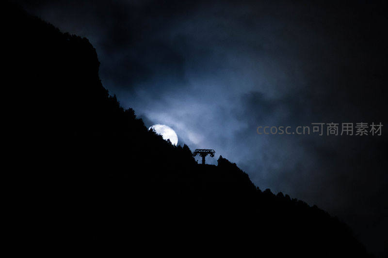 一轮明月从山峦后缓缓升起,云雾缭绕,缆车塔架的黑色剪影矗立在山脊之上,营造出静谧而神秘的夜间氛围。