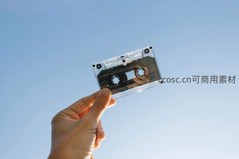 一只手高举透明磁带对着湛蓝无云的天空,阳光透过塑料外壳折射出温暖光晕,唤起人们对黑胶时代和青春岁月的怀旧情感。