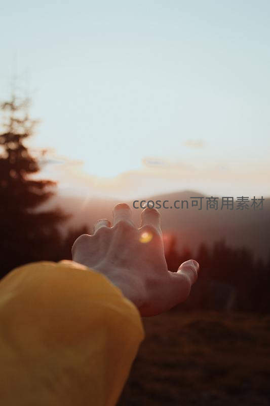 夕阳下伸向山峦的手掌,捕捉温暖的光斑