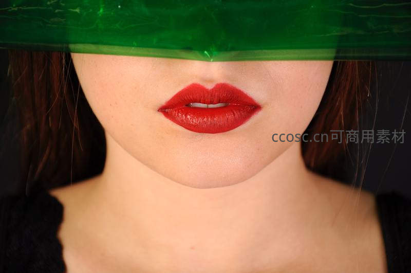 一位女性的红唇在绿色透明物体的遮挡下若隐若现,营造出神秘而时尚的艺术氛围,突显了妆容的精致与视觉冲击力。