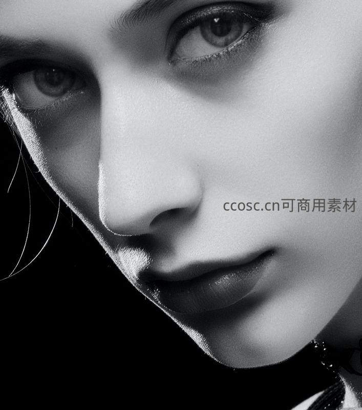 女性以深邃的眼神直视镜头,黑白光影勾勒出面部立体轮廓,展现出冷艳、自信与强烈的视觉张力,极具时尚大片质感。