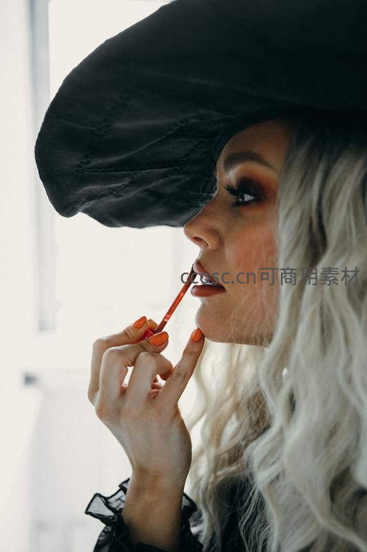 戴着宽檐黑帽的女子侧脸特写,正用唇刷描绘红唇,卷发柔顺垂落,尽显复古优雅风格。