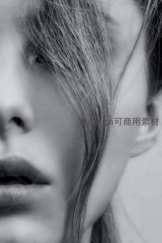 以微距视角聚焦于发丝与肌肤的交界,黑白影像赋予画面诗意朦胧感,突出女性柔美特质与不经意间的自然美感。