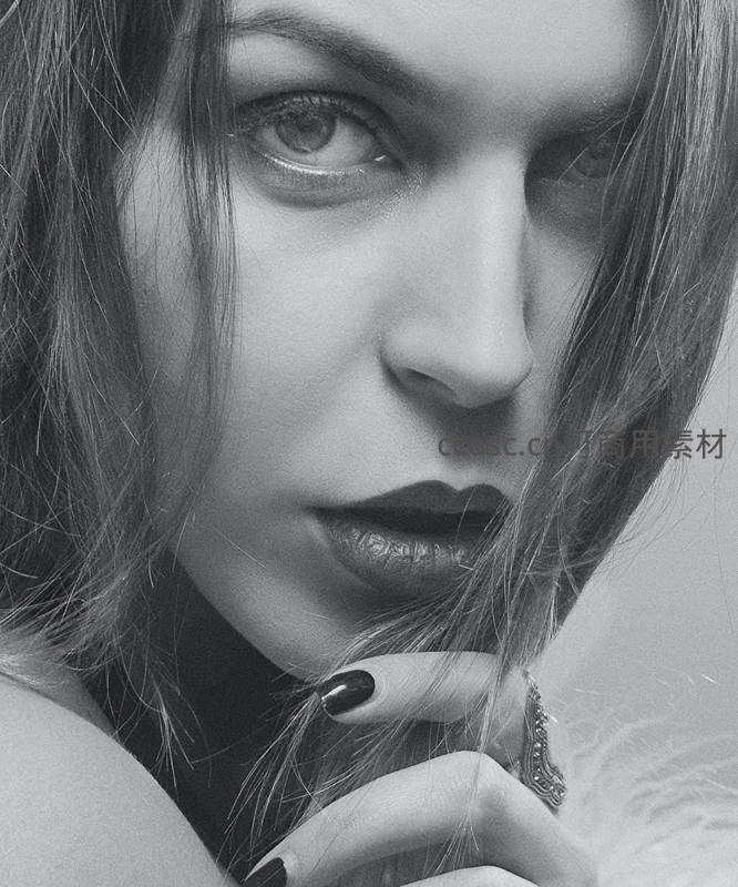 模特以浓重黑唇与深色美甲亮相,搭配精致耳饰,在黑白调下散发冷艳气质,构图紧凑,强调面部表情与饰品细节的视觉冲击。